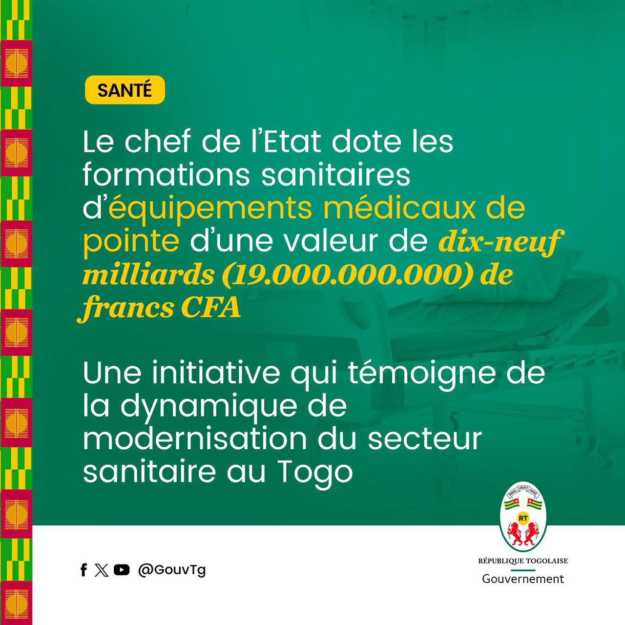 S'inscrivant dans la droite ligne de la politique de santé pour tous du chef de l'État, Son Excellence Faure Essozimna Gnassingbé, le déploiement de ces équipements va contribuer au renforcement du plateau technique des centres de santé du Togo, conformément aux objectifs de la feuille de route gouvernementale.