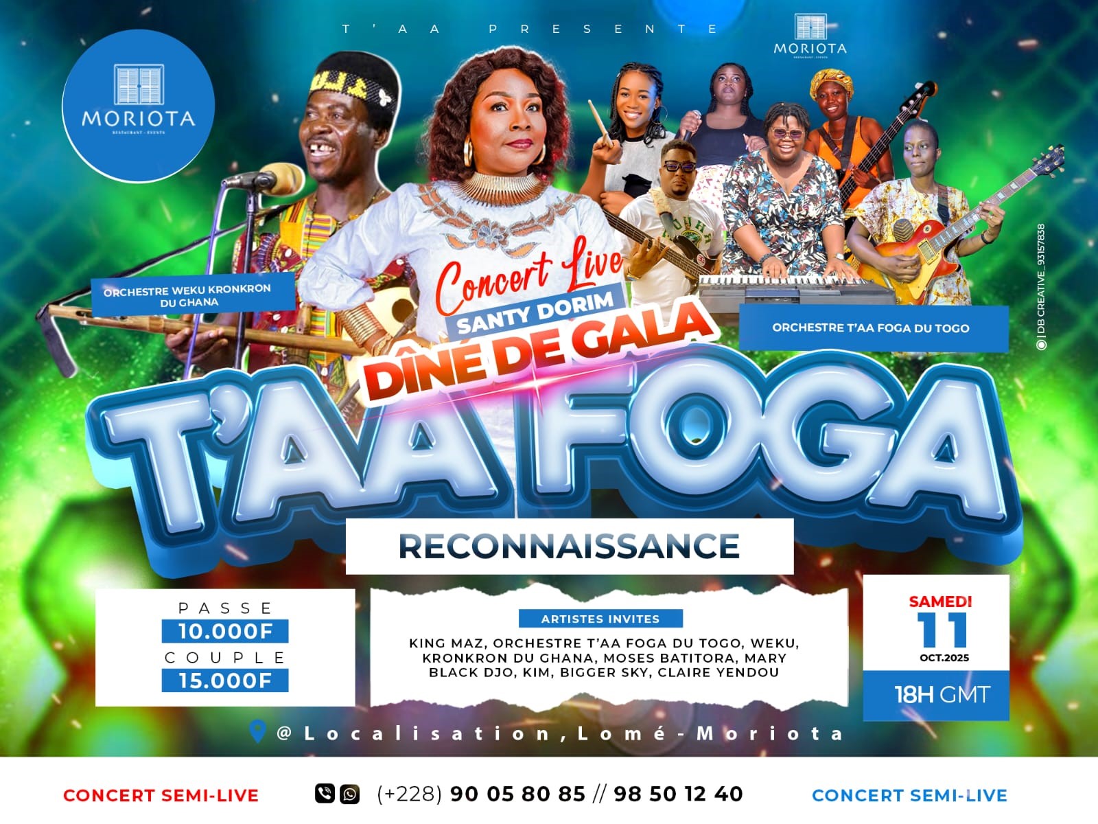 Un « Concert de reconnaissance de Santy Dorim » et un dîner de gala T'aaFoga auront lieu le samedi 11 octobre, à partir de 18 h, au restaurant Moriota. Cet événement vise à exprimer leurs gratitudes à tous ceux qui ont œuvré pour le bien-être et le confort des Togolais en général, et des artistes en particuliers.